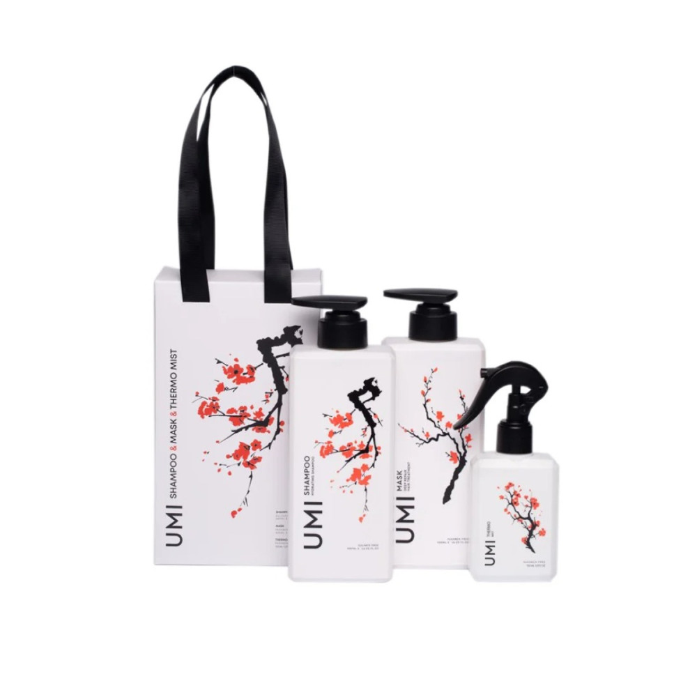 Набір для волосся UMI Haircare Gift Set 3 — це комплексний догляд, що поєднує м’яке очищення, інтенсивне відновлення та захист волосся під час термоукладання. До набору входять: зволожуючий шампунь UMI, відновлююча маска UMI Deep Repair Mask і термозахисний спрей UMI Thermo Mist.